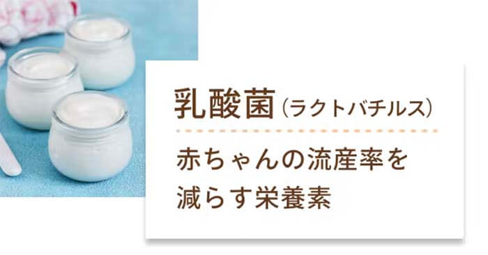 腸や膣などに生息する善玉菌であるラクトバチルスを配合。子宮内フローラを形成し、悪玉菌の増殖を防ぎ、妊娠・出産を助ける重要な役割を持つことが注目されてます。