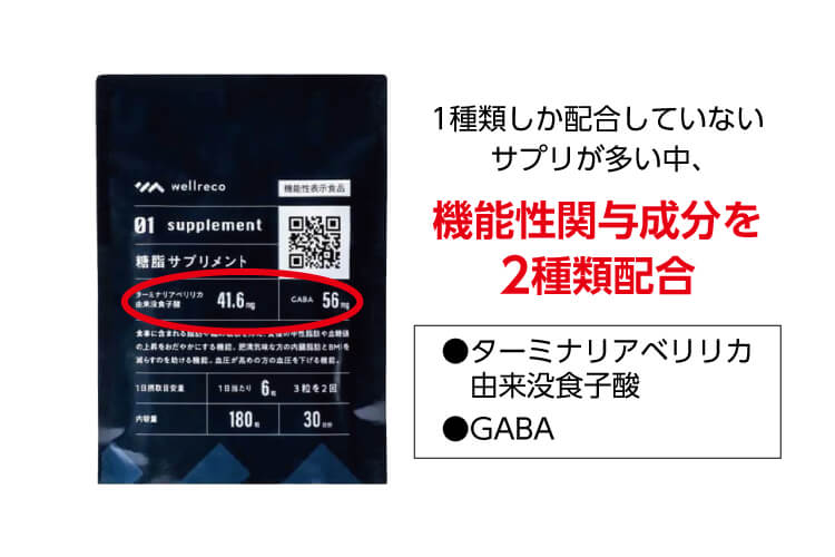 Wellreco(ウェルレコ)糖脂サプリメント:届出番号:H1094 ※本品には、ターミナリアベリリカ由来没食子酸が含まれます。ターミナリアベリリカ由来没食子酸には、食事に含まれる脂肪や糖の吸収を抑え、食後の中性脂肪や血糖値の上昇をおだやかにする機能、肥満気味な方のお腹の脂肪(内臓脂肪と皮下脂肪)とBMIを減らすのを助ける機能が報告されています。 本品にはGABAが含まれます。GABAは血圧が高めの方の血圧を低下させる機能、仕事や勉強などによる一時的な精神的ストレスや疲労感を緩和する機能があることが報告されています。