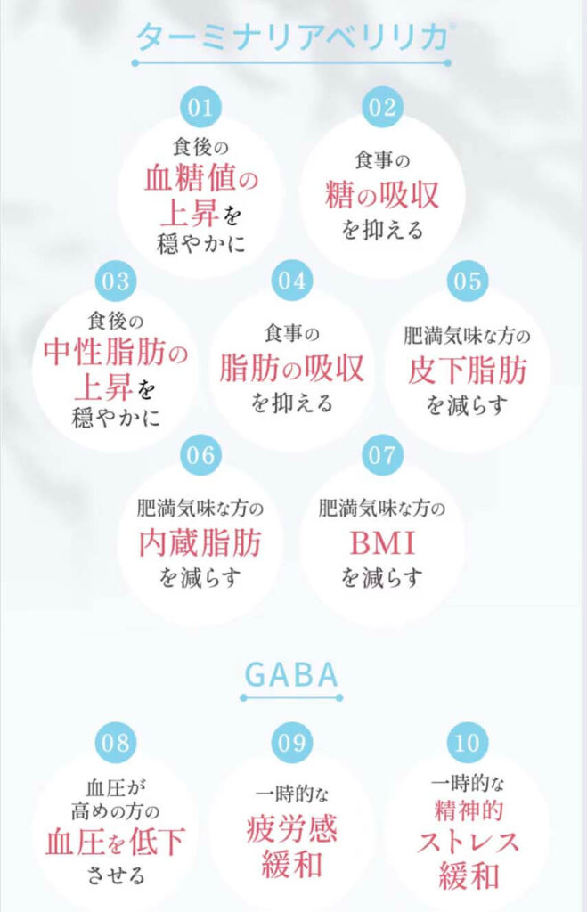 内容紹介のパンフレットが同封されていました。このサプリはターミナリアベリリカの他にもダイエットサプリの王道を征くGABA、カプサイシン、サラシア、ブラックジンジャー、乳酸菌や難消化デキストリンも配合しているよとのことです。